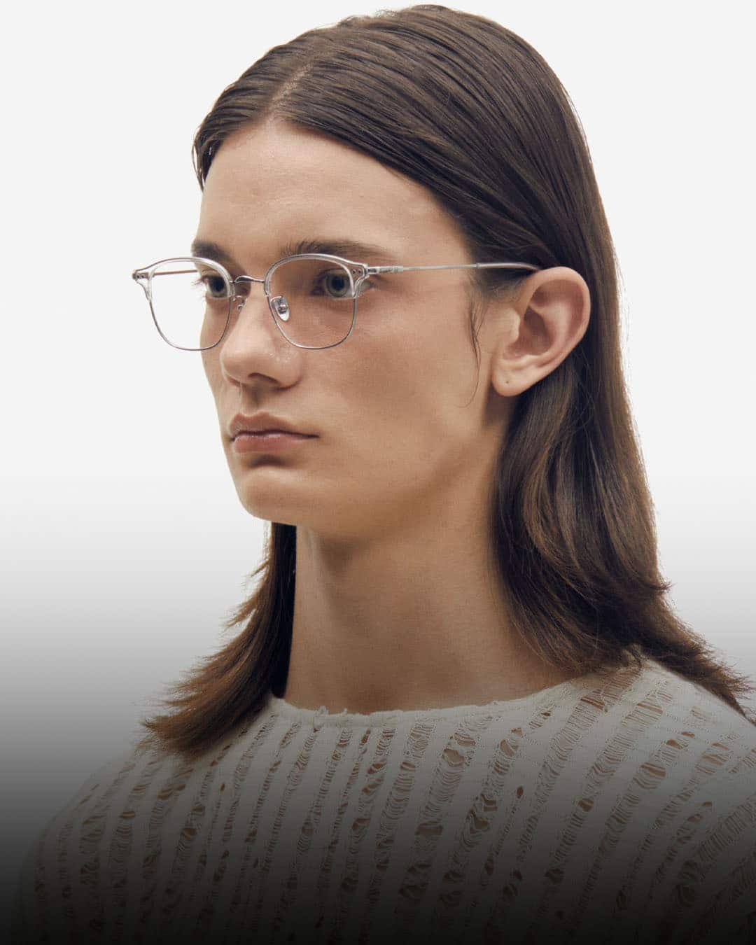 사각 안경테와 하금 안경테를 재해석한 시리즈입니다. 앞과 뒤 다른 두 개 금속의 두께감, 색상 차이, 여백을 통해 하나 된 미로 어우러지게 표현했습니다.