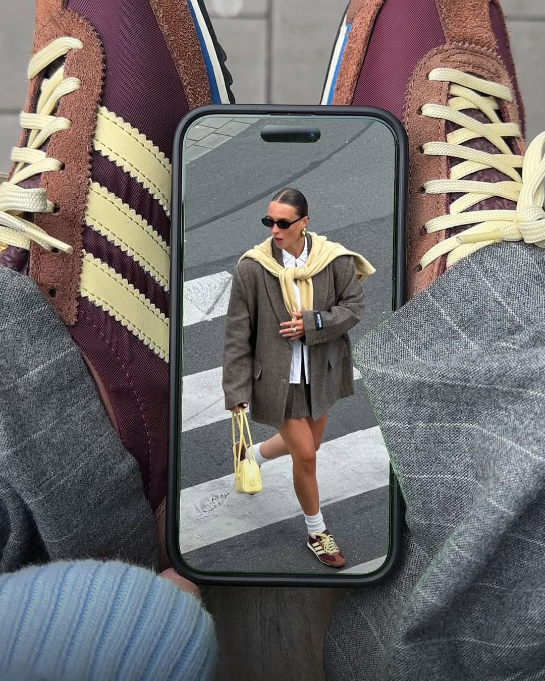 ▫️ OOTD 사진을 띄운 휴대폰을 발 위에 올리고, 다른 휴대폰으로 촬영하기