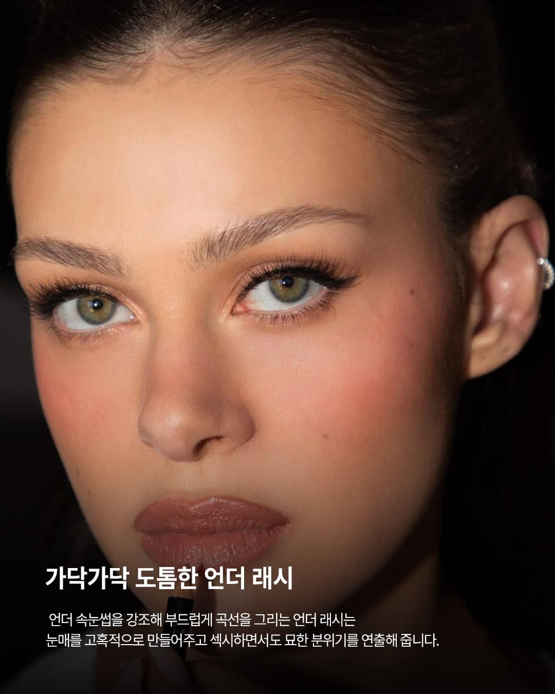 언더 속눈썹을 강조해 부드럽게 곡선을 그리는 언더 래시는 눈매를 고혹적으로 만들어주고 섹시하면서도 묘한 분위기를 연출해 줍니다.