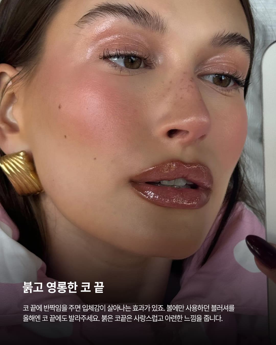코 끝에 반짝임을 주면 입체감이 살아나는 효과가 있죠. 볼에만 사용하던 블러셔를 올해엔 코 끝에도 발라주세요. 붉은 코끝은 사랑스럽고 아련한 느낌을 줍니다.