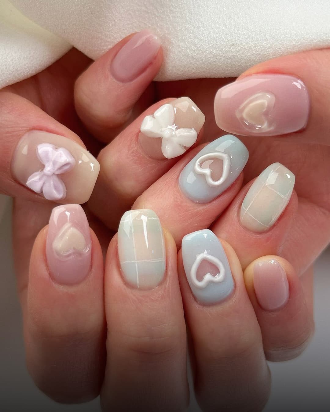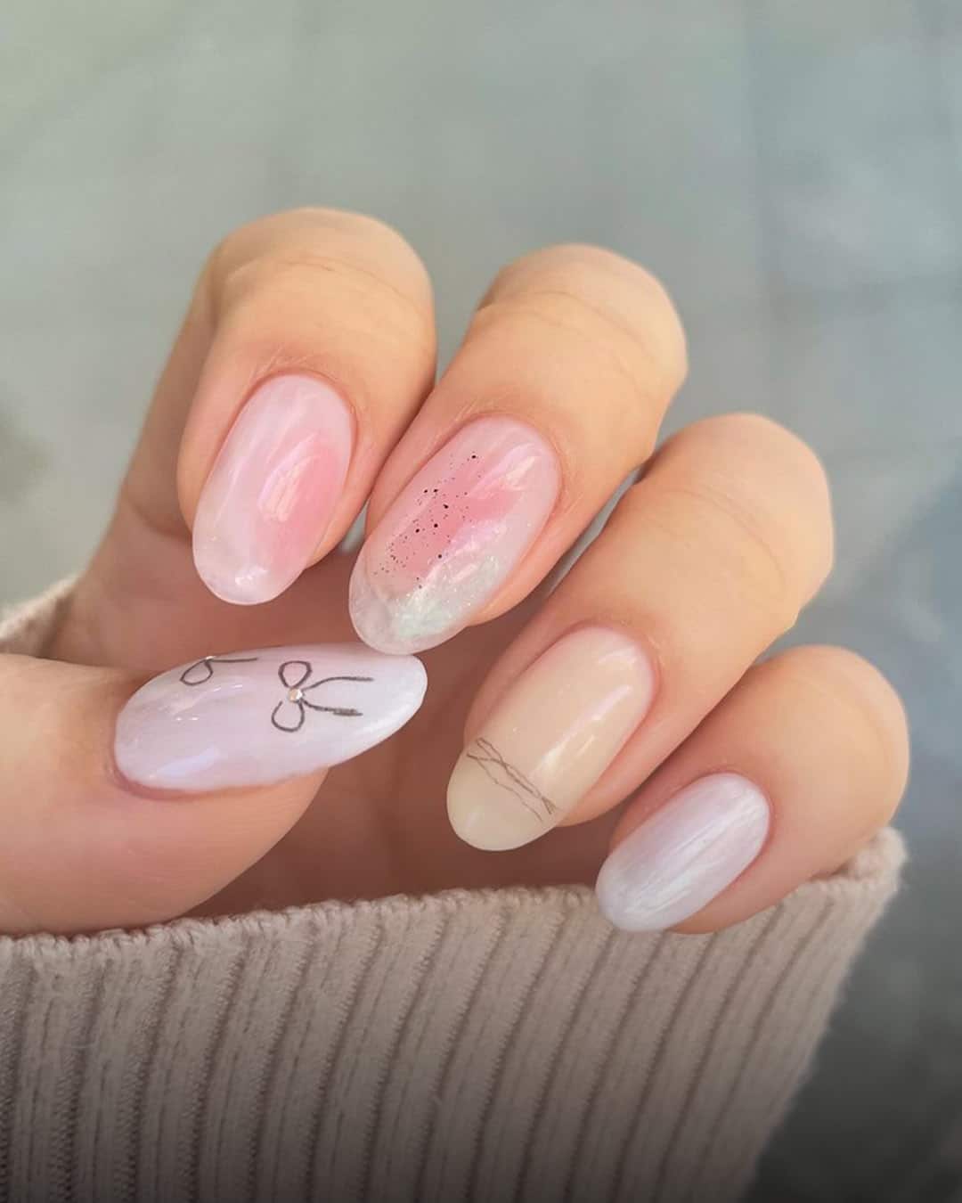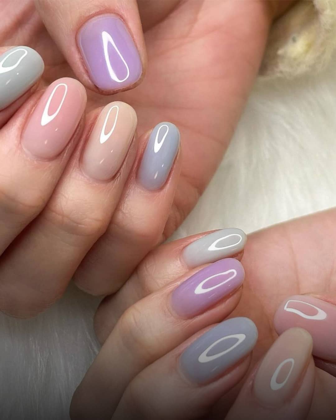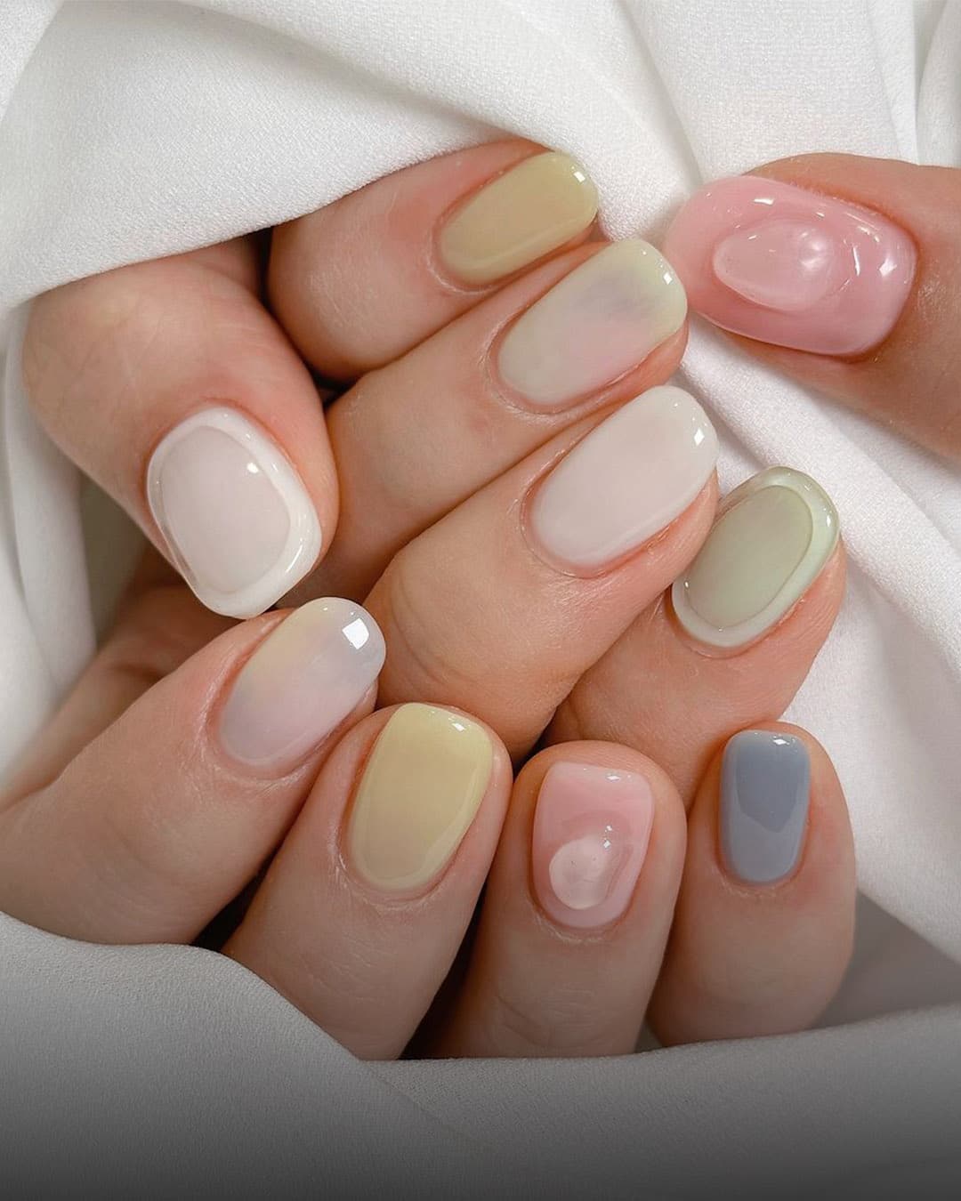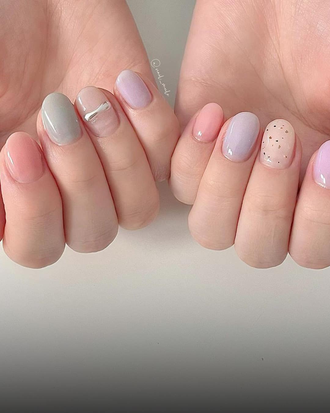 열 손가락을 한 컬러로 통일하는 것도 좋지만, 손톱마다 다른 파스텔 컬러로 구성해 나만의 조합을 만들어 보는 것도 좋은 방법입니다.
