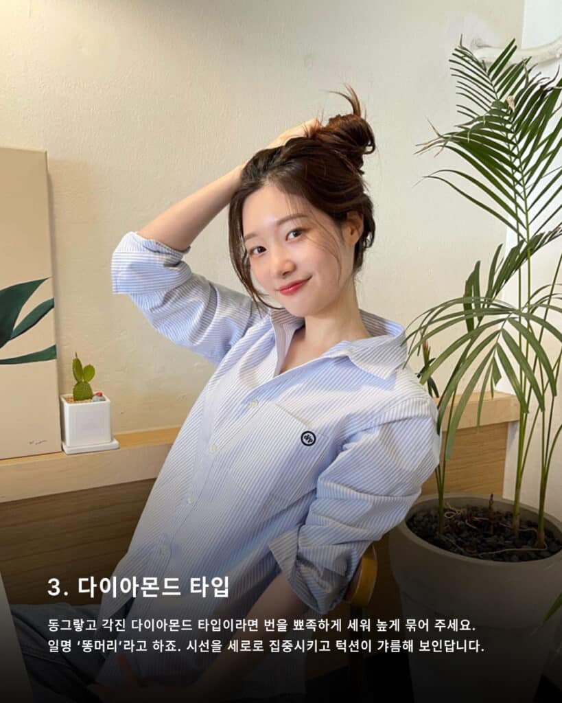 길고 각진 타입, 둥근 타입, 긴 하트형 타입, 다이아몬드 타입으로 나눠 얼굴형별 추천하는 묶음 머리 위치와 종류를 소개합니다.