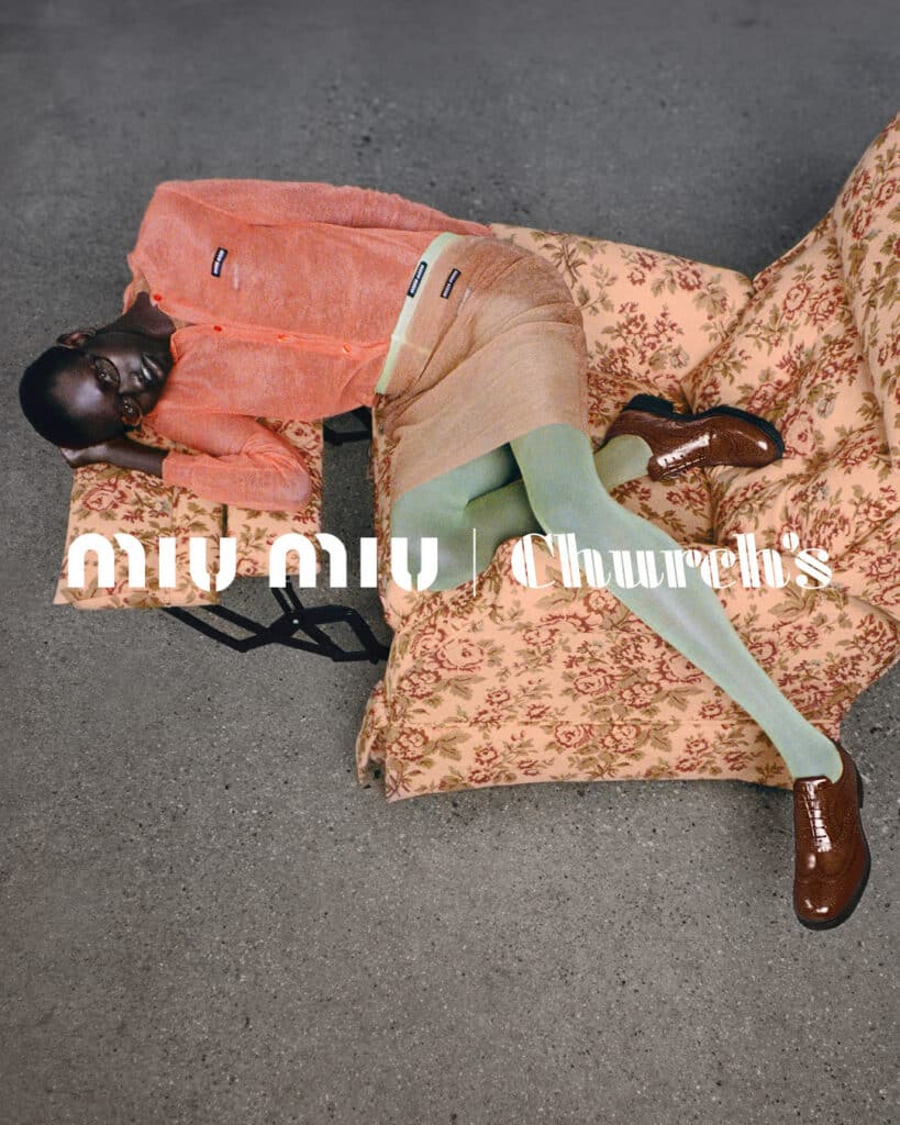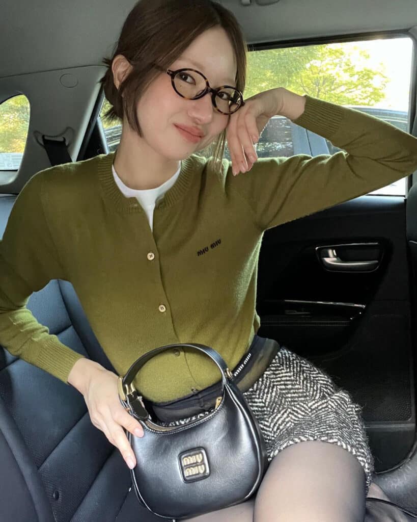 파스텔 톤의 스타킹을 무려 하의보다 높게 신어 스타킹이 과감하게 드러나는 스타일링을 선보인 미우미우 23 FW 컬렉션.