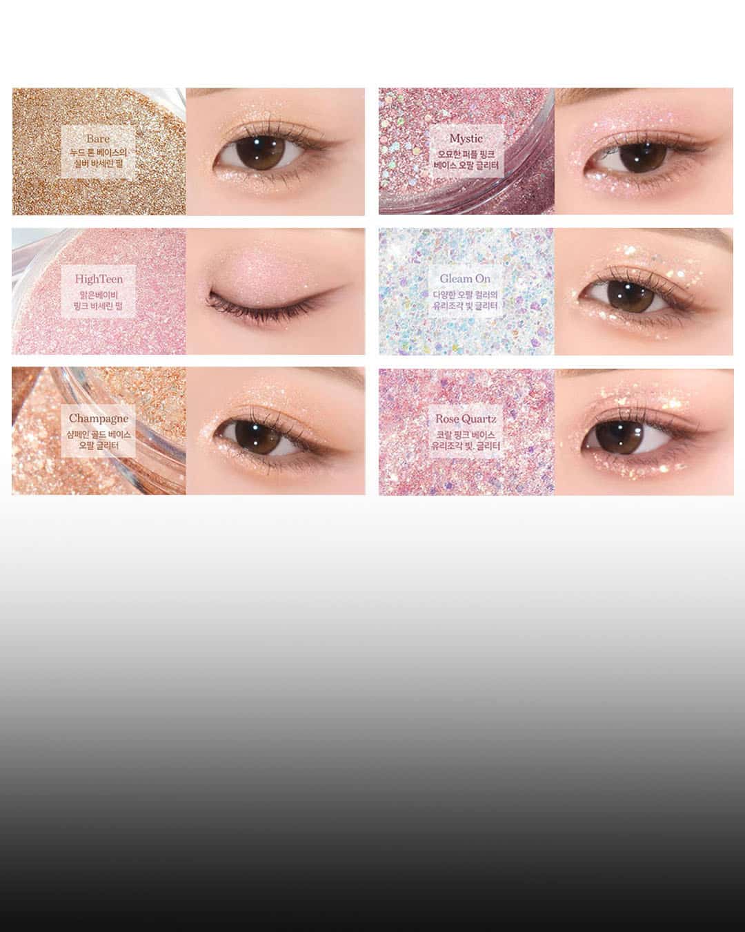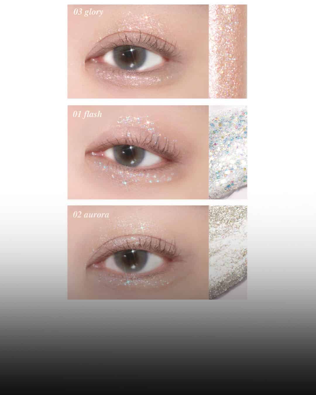 베이스, 하이라이터, 애굣살까지 활용 가능한 작고 촘촘한 글리터 포뮬러로 가루날림 없이 촉촉하게 밀착