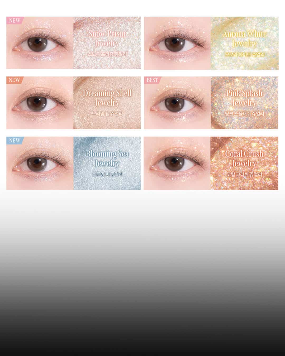 수분 베이스 66%로 하루 종일 촉촉하게 빛나는 눈가, 깨진 유리에 반사된 빛을 닮은 아이 글리터