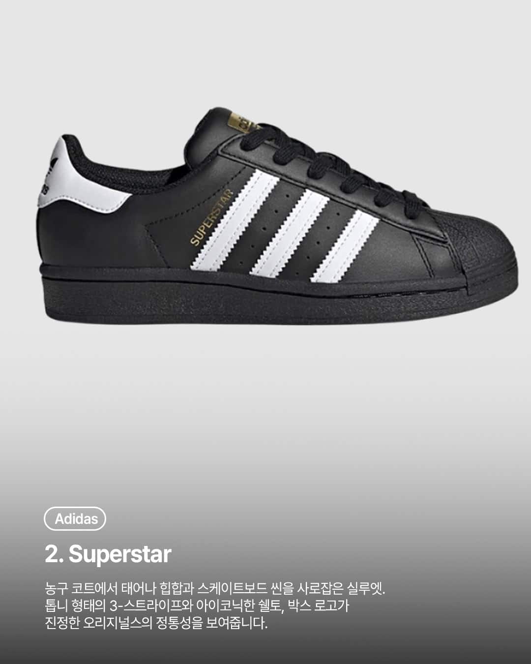 농구 코트에서 태어나 힙합과 스케이트보드 씬을 사로잡은 실루엣. 톱니 형태의 3-스트라이프와 아이코닉한 쉘토, 박스 로고가 진정한 오리지널스의 정통성을 보여줍니다.