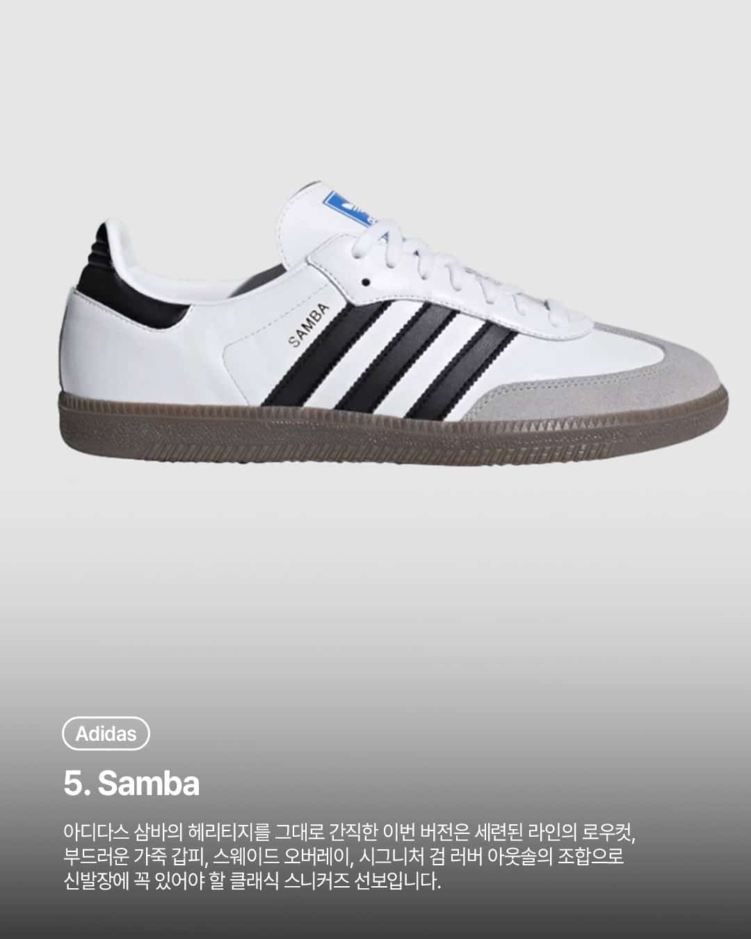 아디다스 삼바의 헤리티지를 그대로 간직한 이번 버전은 세련된 라인의 로우컷, 부드러운 가죽 갑피, 스웨이드 오버레이, 시그니처 검 러버 아웃솔의 조합으로 신발장에 꼭 있어야 할 클래식 스니커즈 선보입니다.
