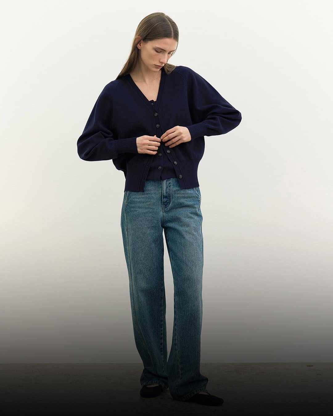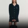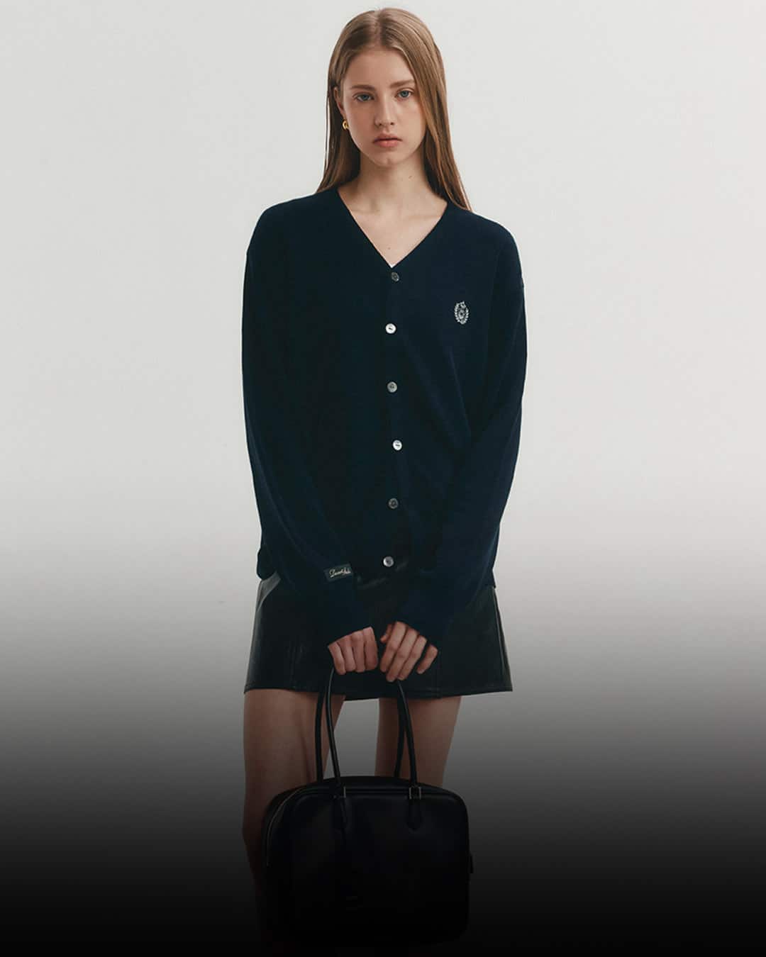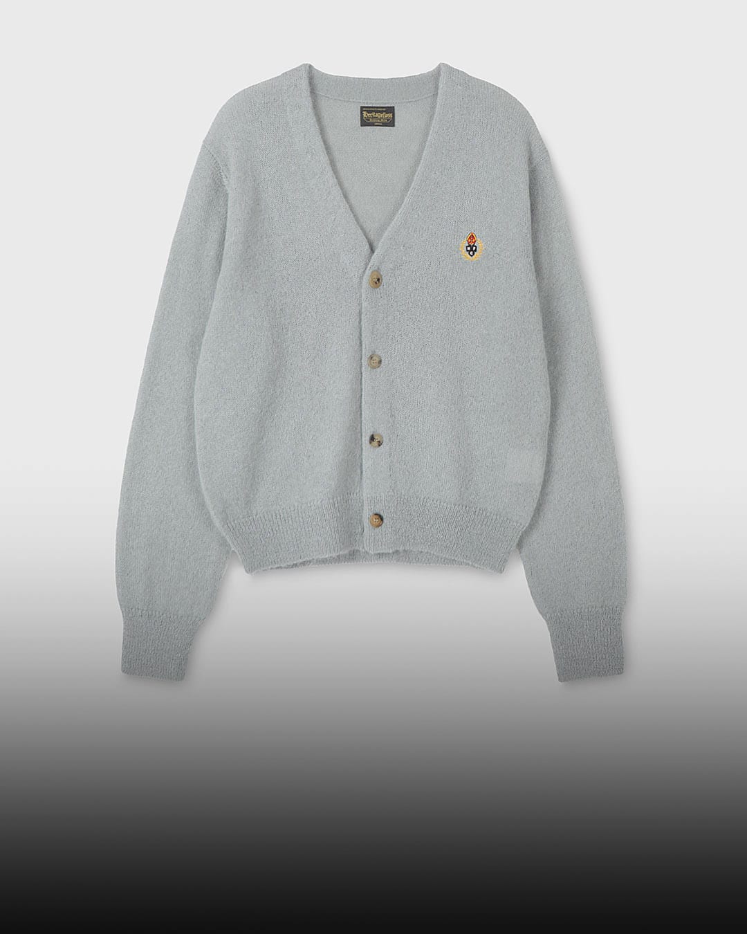 모헤어 원사로 짜여진 가디건. 단독 또는 아우터 안에 이너로 착용하기 좋은 두께감이며, 로고 음각된 소뿔 단추가 포인트입니다.