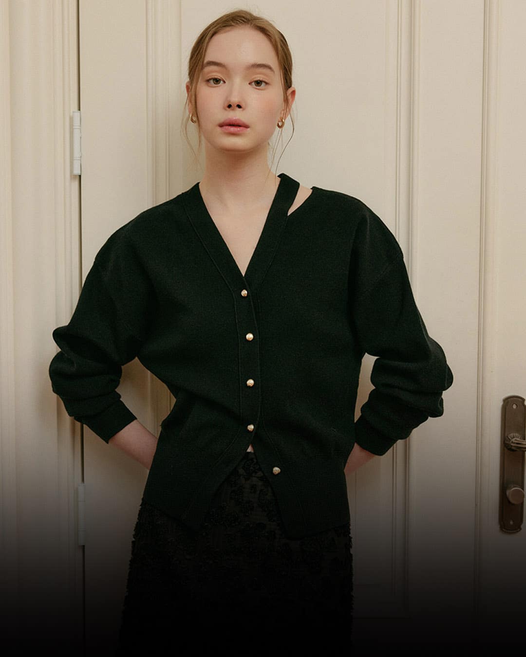넥 라인에 커팅 디테일이 매력적인 브이넥 니트 가디건입니다.