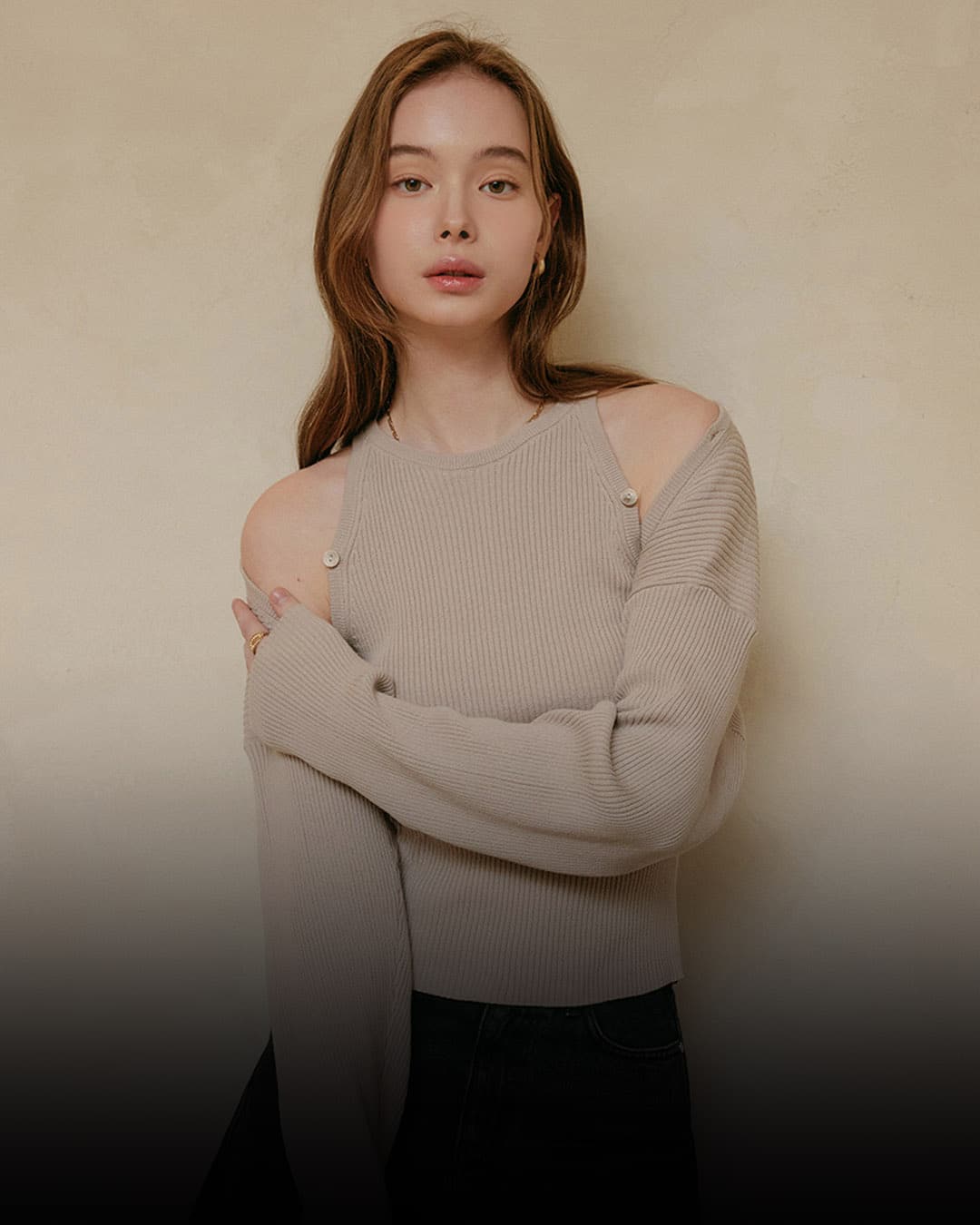 구조적인 실루엣의 이중지조직의 가디건과 골조직으로 스트레치가 좋은 끈탑 뷔스티에를 셋업으로 제안합니다.