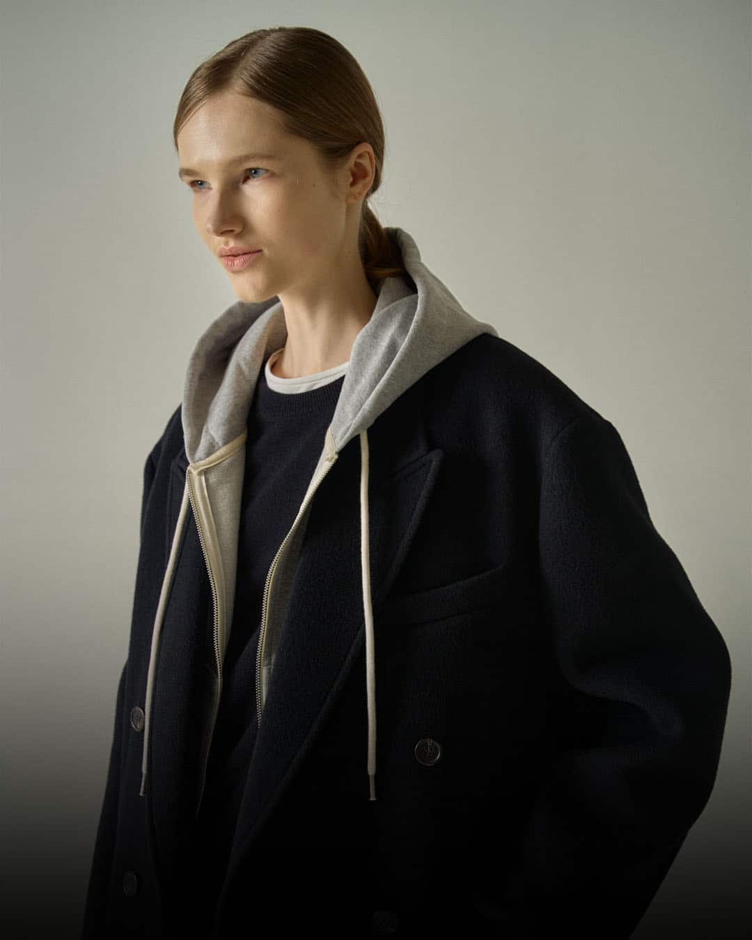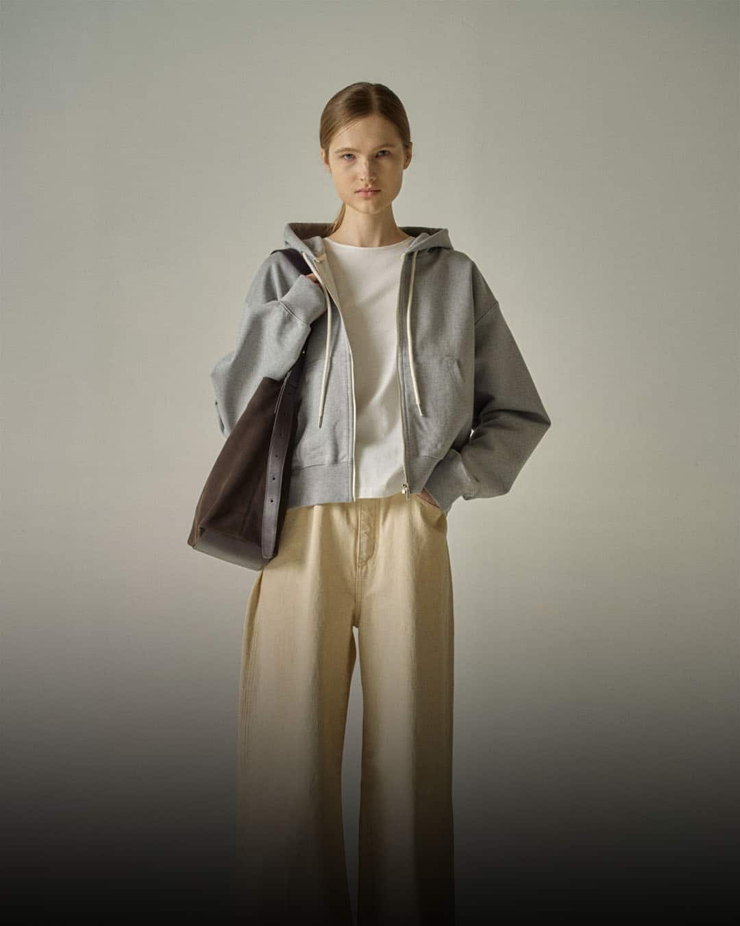 그레이 후드 집업과 더블 롱 코트의 조합은 미우미우 런웨이룩을 뚝딱 완성시킨다. 한겨울에 보온 효과까지 얻을 수 있으니 하나쯤 소장하길 추천한다.