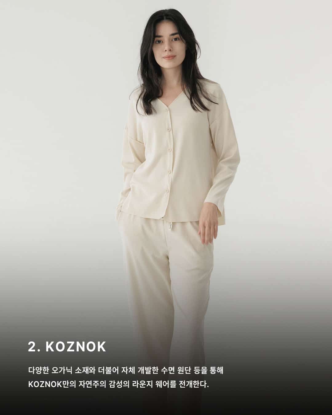 다양한 오가닉 소재와 더불어 자체 개발한 수면 원단 등을 통해 KOZNOK만의 자연주의 감성의 라운지 웨어를 전개한다.