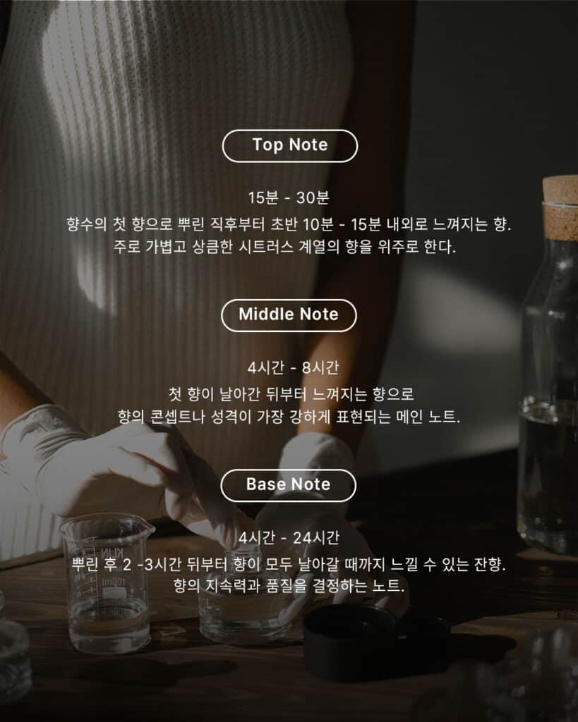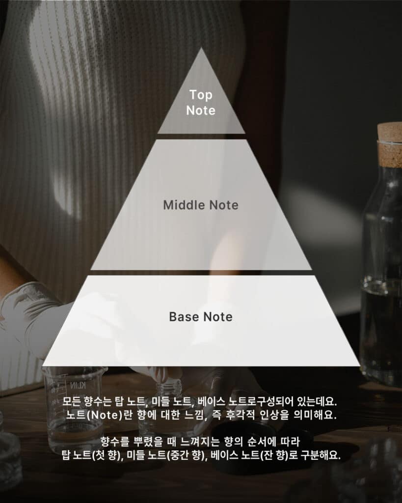 모든 향수는 탑 노트, 미들 노트, 베이스 노트로 구성되어 있는데요. 노트(Note)란 향에 대한 느낌, 즉 후각적 인상을 의미해요. 향수를 뿌렸을 때 느껴지는 향의 순서에 따라 탑 노트(첫 향), 미들 노트(중간 향), 베이스 노트(잔 향)로 구분해요.