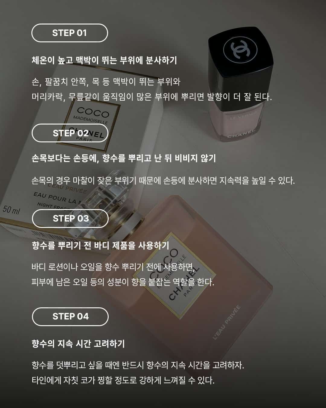 손, 팔꿈치 안쪽, 목 등 맥박이 뛰는 부위와 머리카락, 무릎같이 움직임이 많은 부위에 뿌리면 발향이 더 잘 된다.