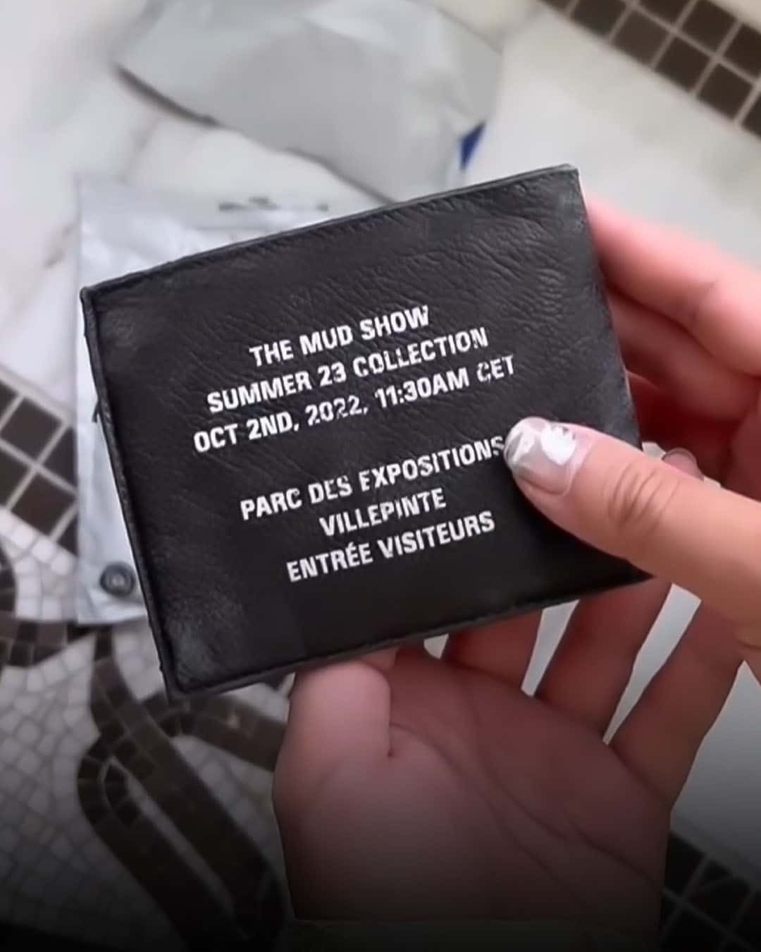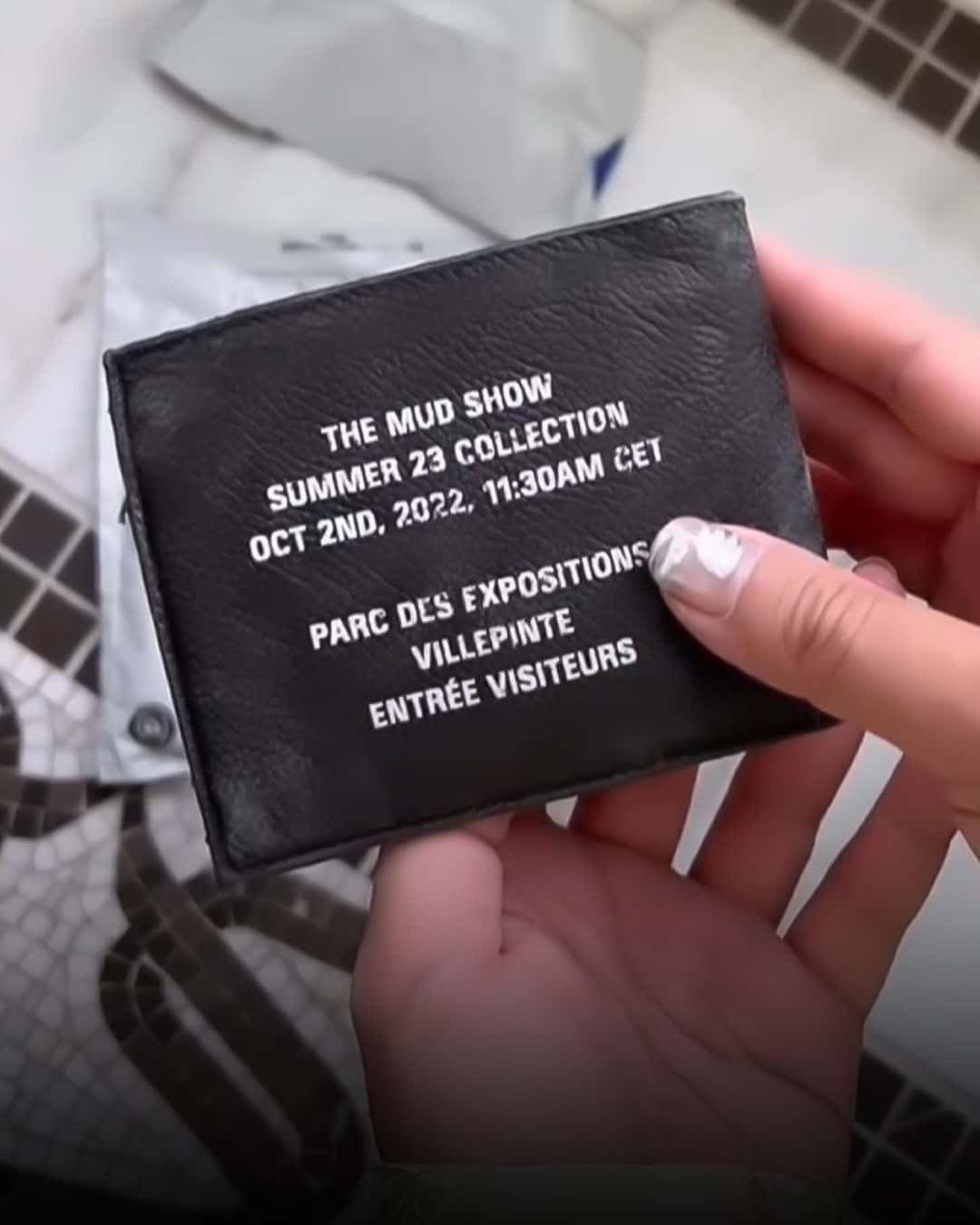 The invitation for the Balenciaga 2023 S/S collection was an old wallet. Inside the wallet, there were mysterious receipts, an ID card, and a cat photo. On the back of the wallet, the theme of the show, ‘The Mud Show,’ along with the date and time, were written.