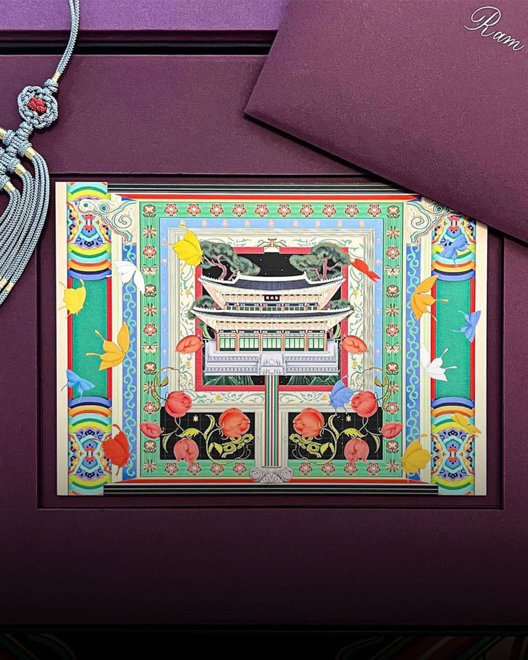 The invitation for the Gucci 2024 Cruise Collection, held at Gyeongbokgung Palace, was designed by the domestic digital designer ‘Ramhan.’ The invitation beautifully captured Gyeongbokgung Palace, combining flowers and butterflies with pine trees in the illustration inside.