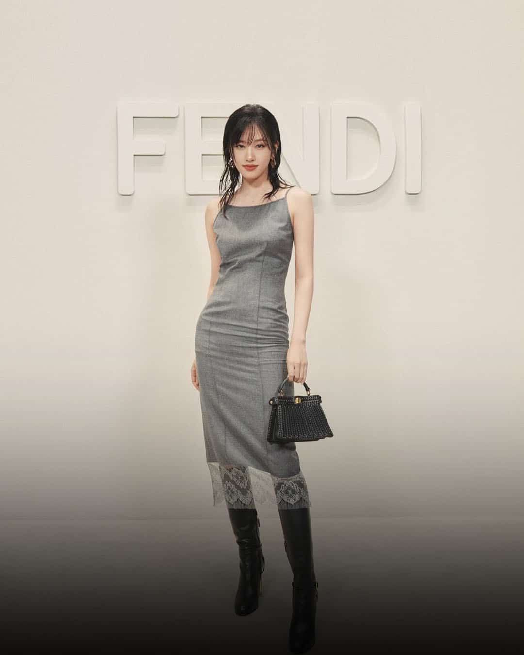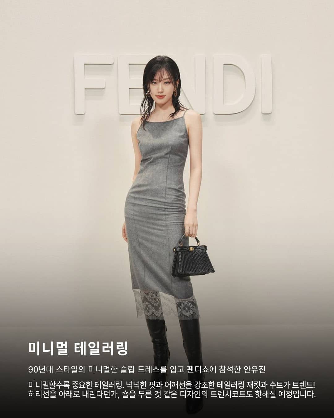 90년대 스타일의 미니멀한 슬립 드레스를 입고 펜디쇼에 참석한 안유진(@_yujin_an)
