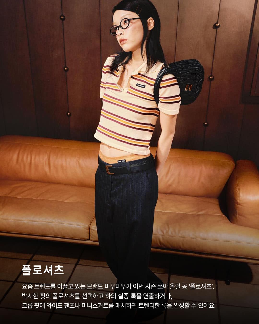 요즘 트렌드를 이끌고 있는 브랜드 미우미우가 이번 시즌 쏘아 올릴 공 ‘폴로셔츠’. 박시한 핏의 폴로셔츠를 선택하고 하의 실종 룩을 연출하거나, 크롭 핏에 와이드 팬츠나 미니스커트를 매치하면 트렌디한 룩을 완성할 수 있어요.