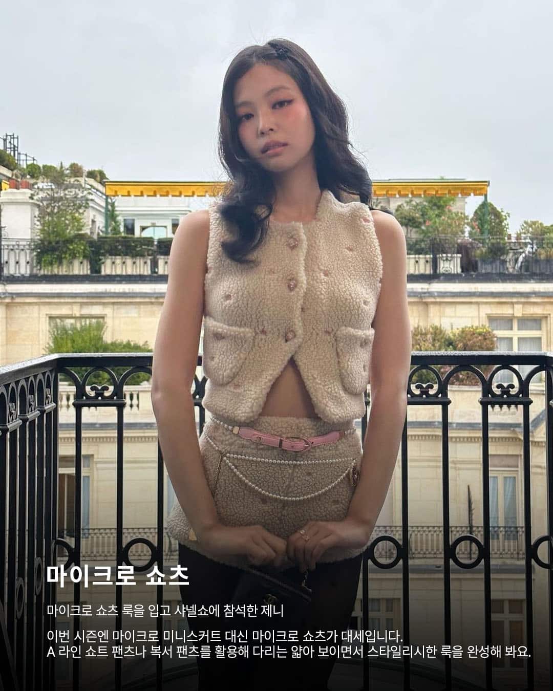 마이크로 쇼츠 룩을 입고 샤넬쇼에 참석한 제니(@jennierubyjane)