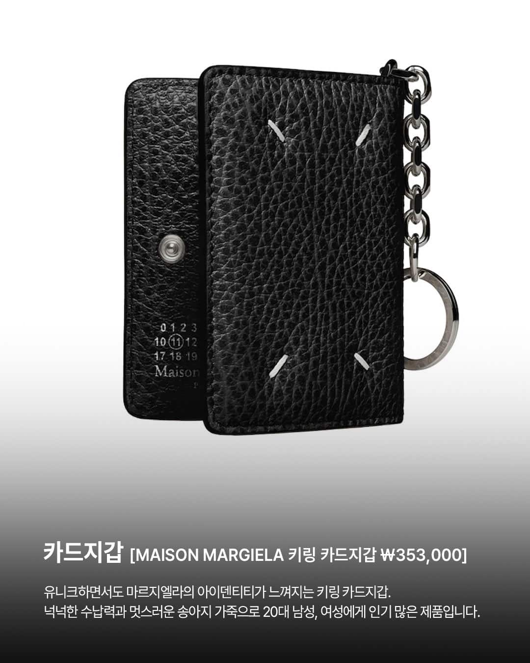 유니크하면서도 마르지엘라의 아이덴티티가 느껴지는 키링 카드지갑. 넉넉한 수납력과 멋스러운 송아지 가죽으로 20대 남성, 여성에게 인기 많은 제품입니다.