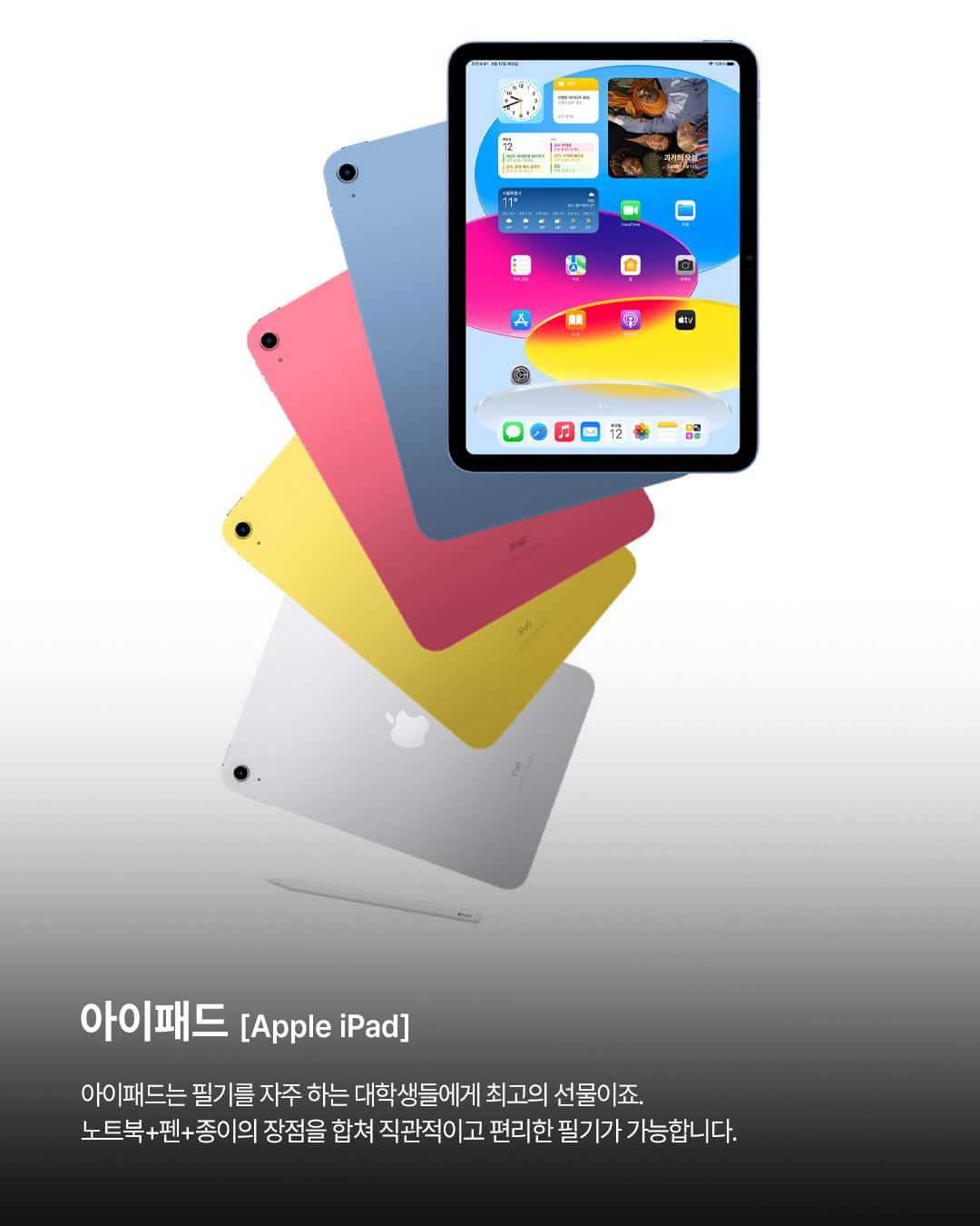 아이패드는 필기를 자주 하는 대학생들에게 최고의 선물이죠. 노트북+펜+종이의 장점을 합쳐 직관적이고 편리한 필기가 가능합니다.