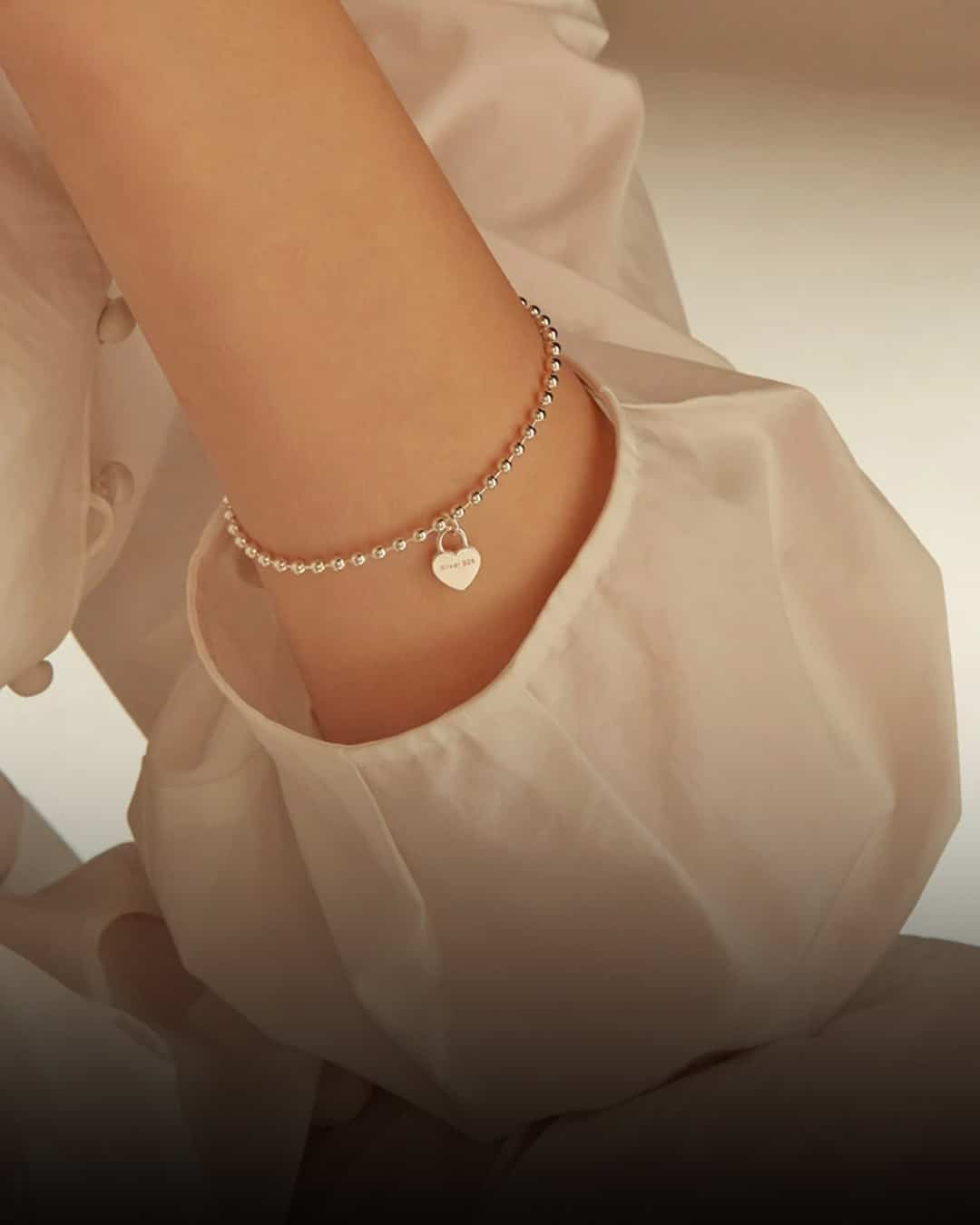 A bracelet featuring a ball chain with a mini heart charm, allowing you to create a lovely atmosphere.