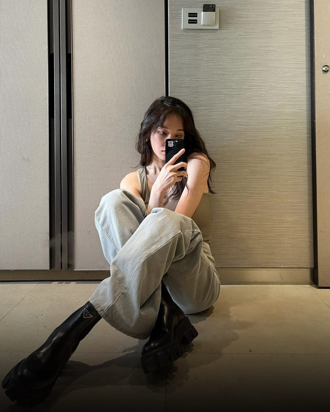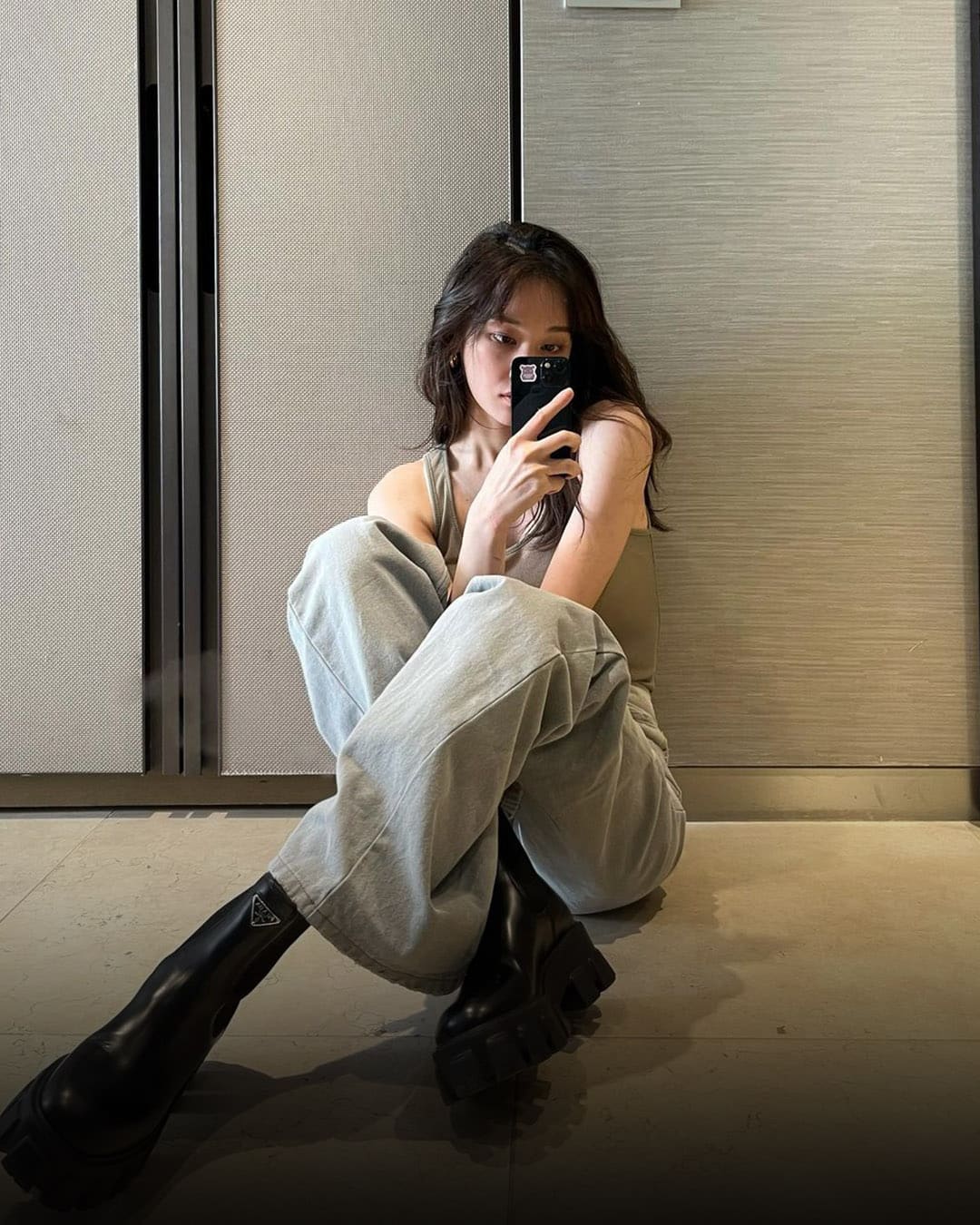 4️⃣ Completing a neutral look by mixing a khaki sleeveless top with light denim and Prada leather boots