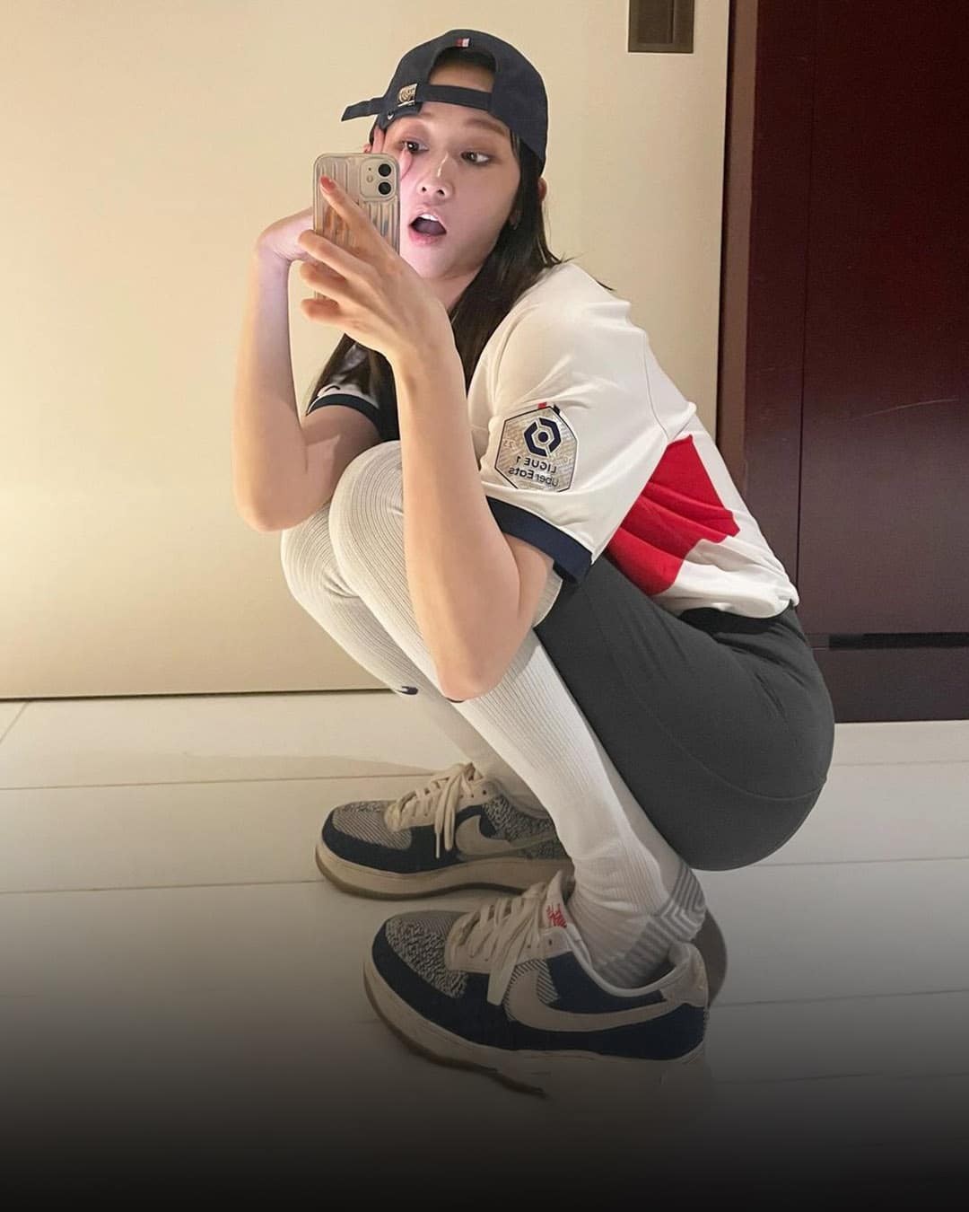1️⃣ Completing a playful yet feminine block core look with Paris Saint-Germain uniform, sporty leggings, and a baseball cap