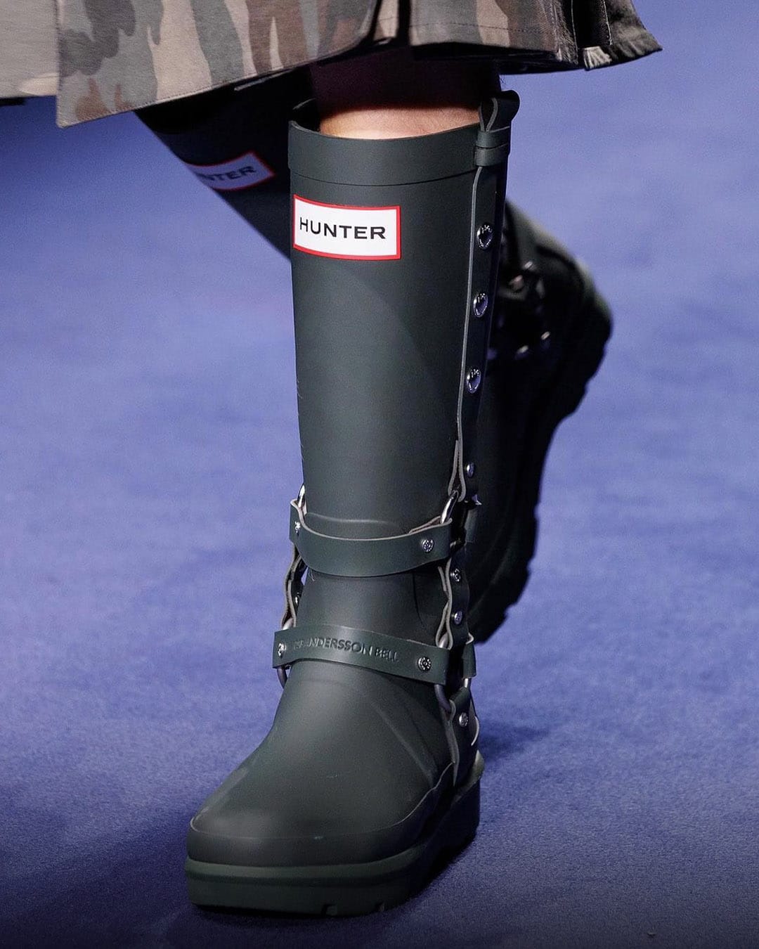 24FW 앤더슨벨 밀란 패션위크에서 선보이며 화제가 되기도 했었는데요. 청키하고 볼드한 아웃솔과 현대적이고 세련된 둥근 앞코가 특징인 헌터 오리지날 2.0 레인부츠의 쉐입은 그대로 차용하고, 엔더슨벨 빈티지 아카아브의 디테일을 참고한 더블 하네스 디자인을 커스터마이징해 헌터의 아이코닉 아이템을 재탄생 시켰습니다.