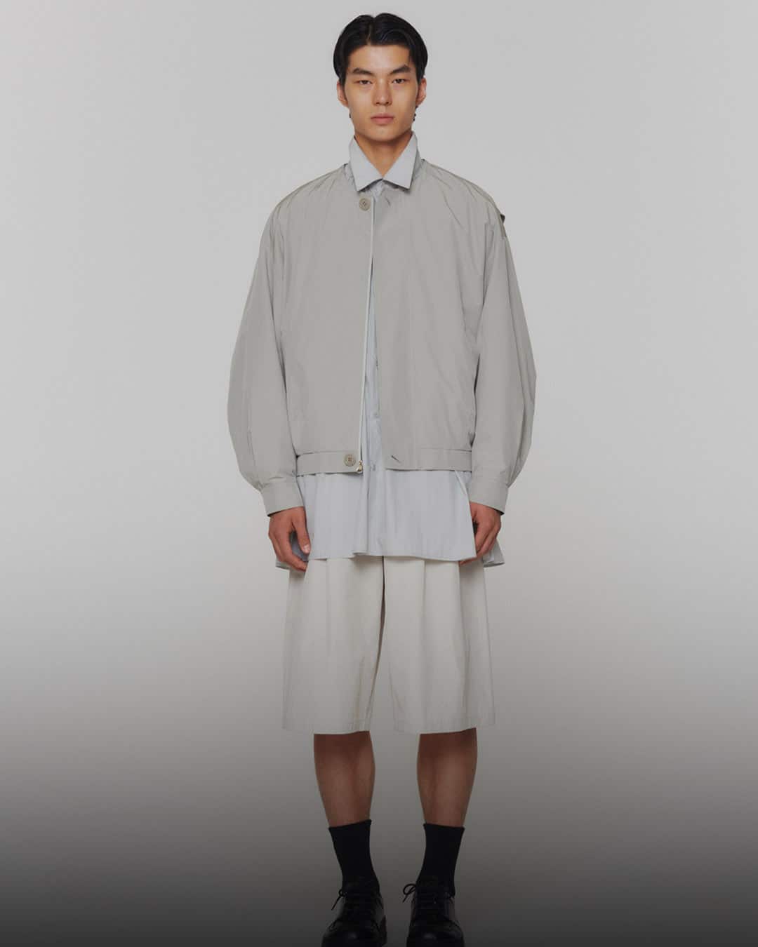 3️⃣ COTTON NYLON VOLUME JUMPER / OVERSIZE SHIRRING SHIRTS / TWO TUCK WIDE SHORTS
