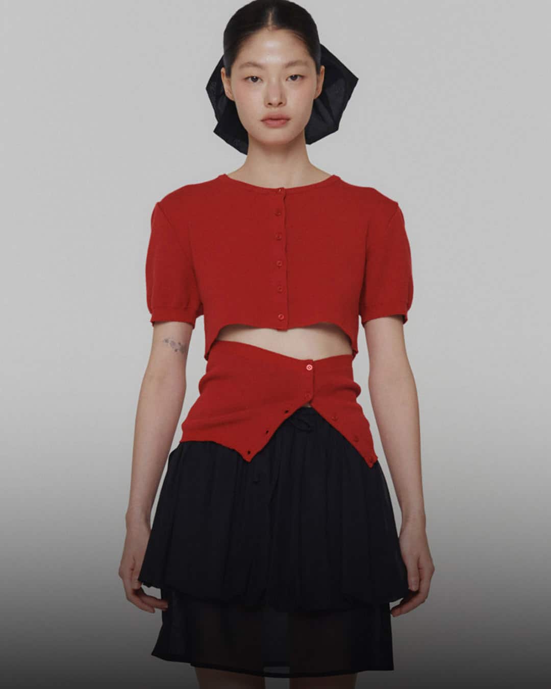 4️⃣ CROP BUTTON CARDIGAN SET / SHEER LAYERED SKIRT