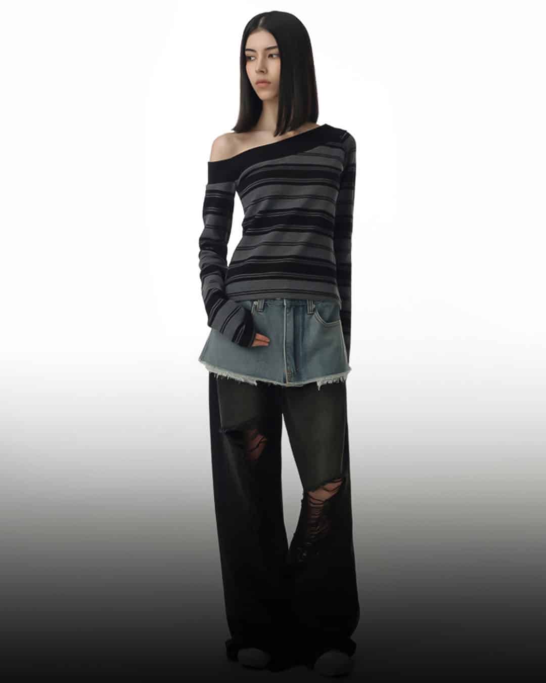 ▫️ @millowomen One-Shoulder Stripe T-Shirt [Charcoal Gray] – KRW 68,000