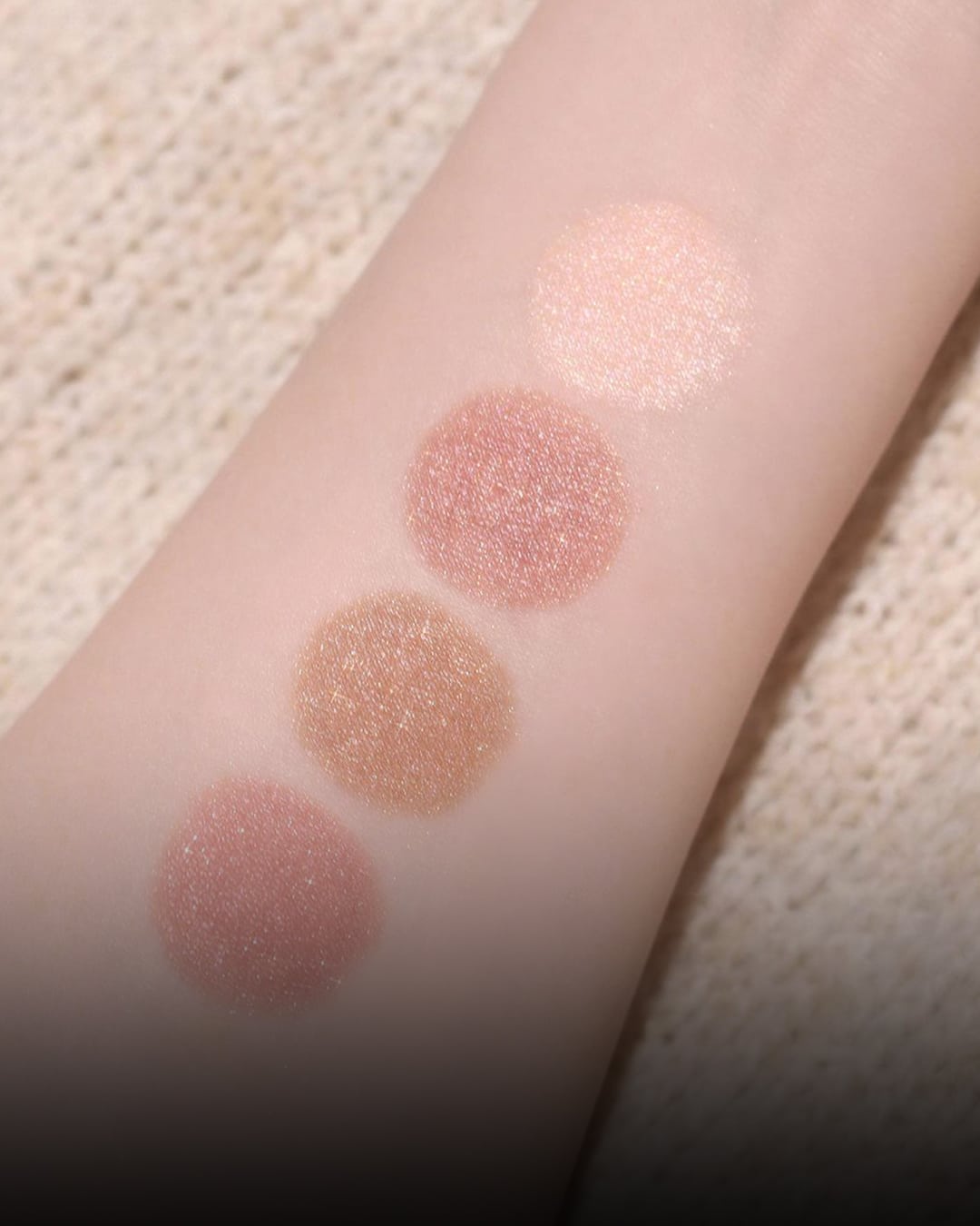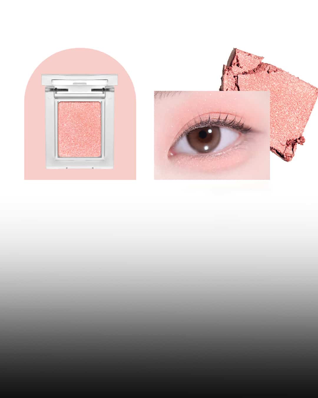 A delicate peach matte eyeshadow with a sprinkle of pink, gold, and white glitter.