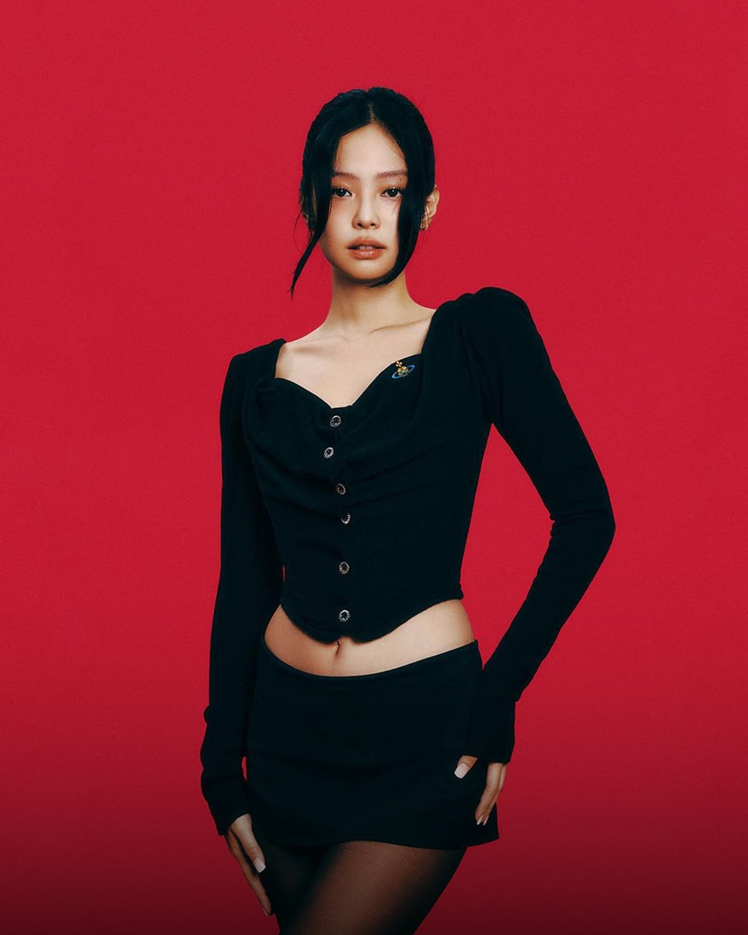 With her slightly lifted cat-eye, voluminous lips, and sultry feline features, Jennie pulls off the bold red look effortlessly.