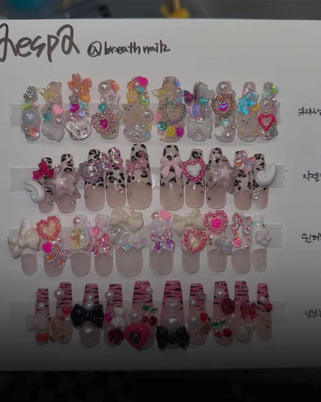 Breath Nail, known for creating buzz with their iron taste nails using chrome silver, also contributed to Aespa’s Japanese debut single ‘Hot Mess’. They showcase a wide range of nail designs, from bizarre atmospheres using various materials to kitschy nails filled with colorful Japanese sensibilities.