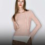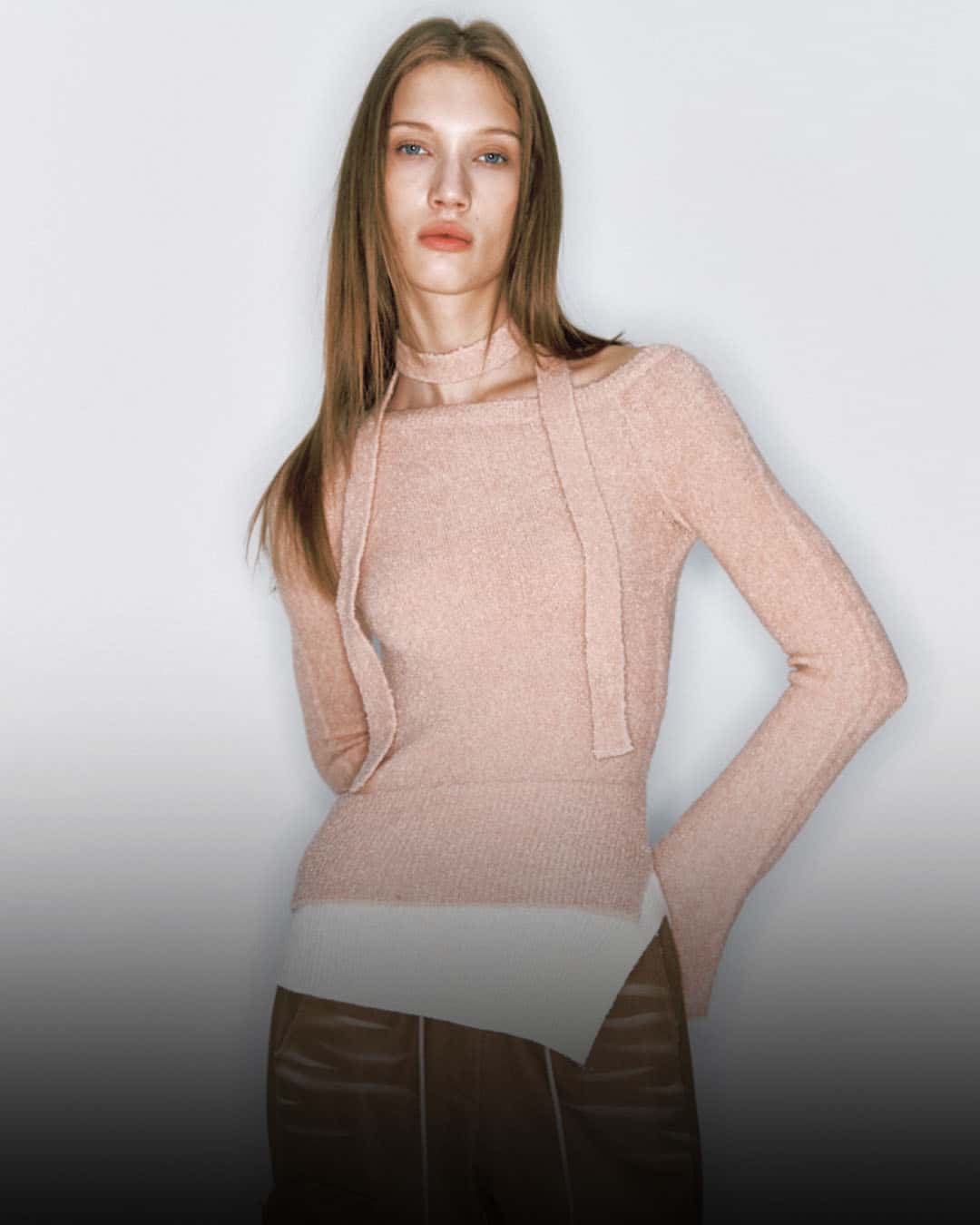 A soft touch cutout knit top. Adds femininity with a slim silhouette and cutout details, and allows for diverse styles with its logo-adorned scarf setup.