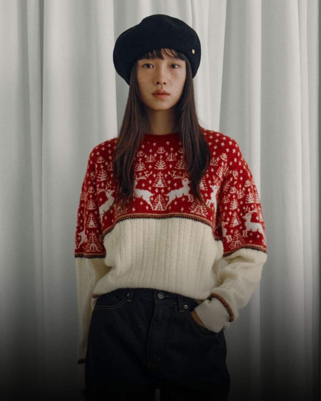A sweater that adds a touch of joy to winter daily life with a combination of reindeer patterns reminiscent of Christmas and stripe colors as accents.